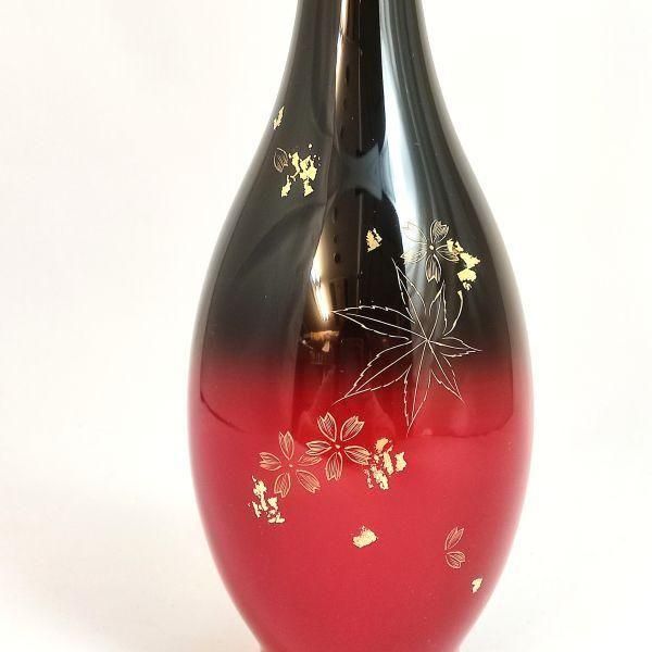 すっきりとした鶴首型の花生けに桜と紅葉の沈金を施し、華やかに箔を散らしました。